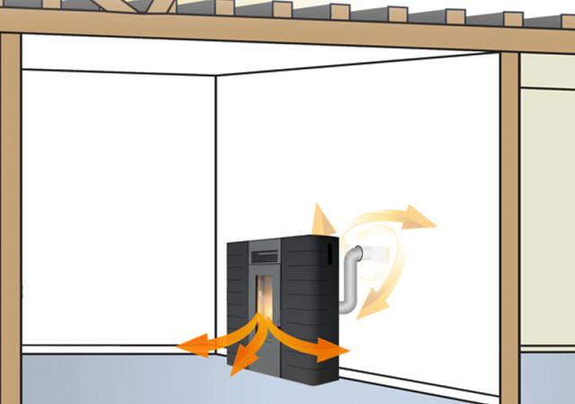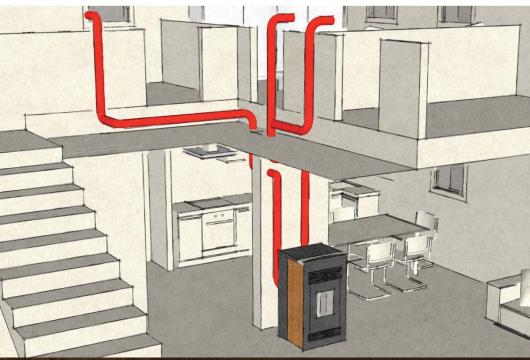 Een ruimte kortbij, of een aanpalende ruimte kan makkelijk verwarmt worden door een pelletkachel met kanalisatie. Langs de achterzijde of flanken van de kachel zullen er dan extra ventilatiegaten voorzien worden. Hierop wordt een buis aangesloten zodat de warmte makkelijk en snel getransporteerd word naar de ruimte.